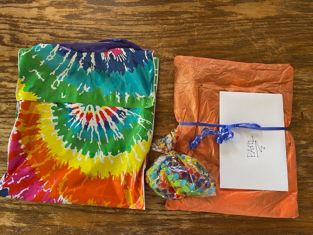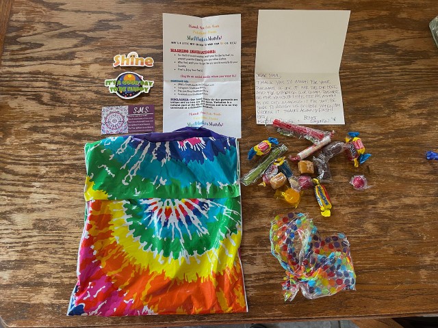 The shirt came in a tie-dye package. Inside was my shirt, a handwritten thank you note, stickers, candy, and care instructions.