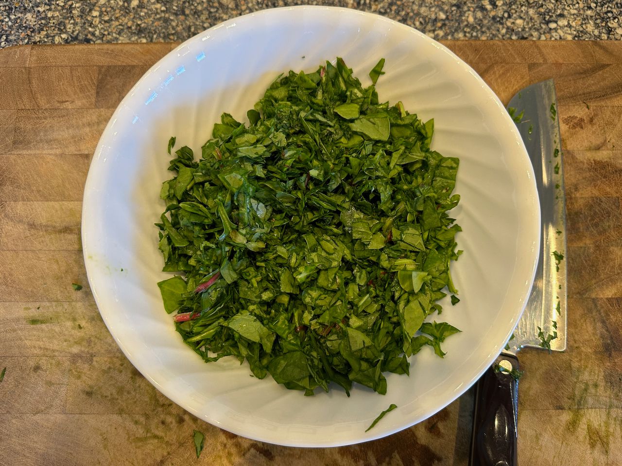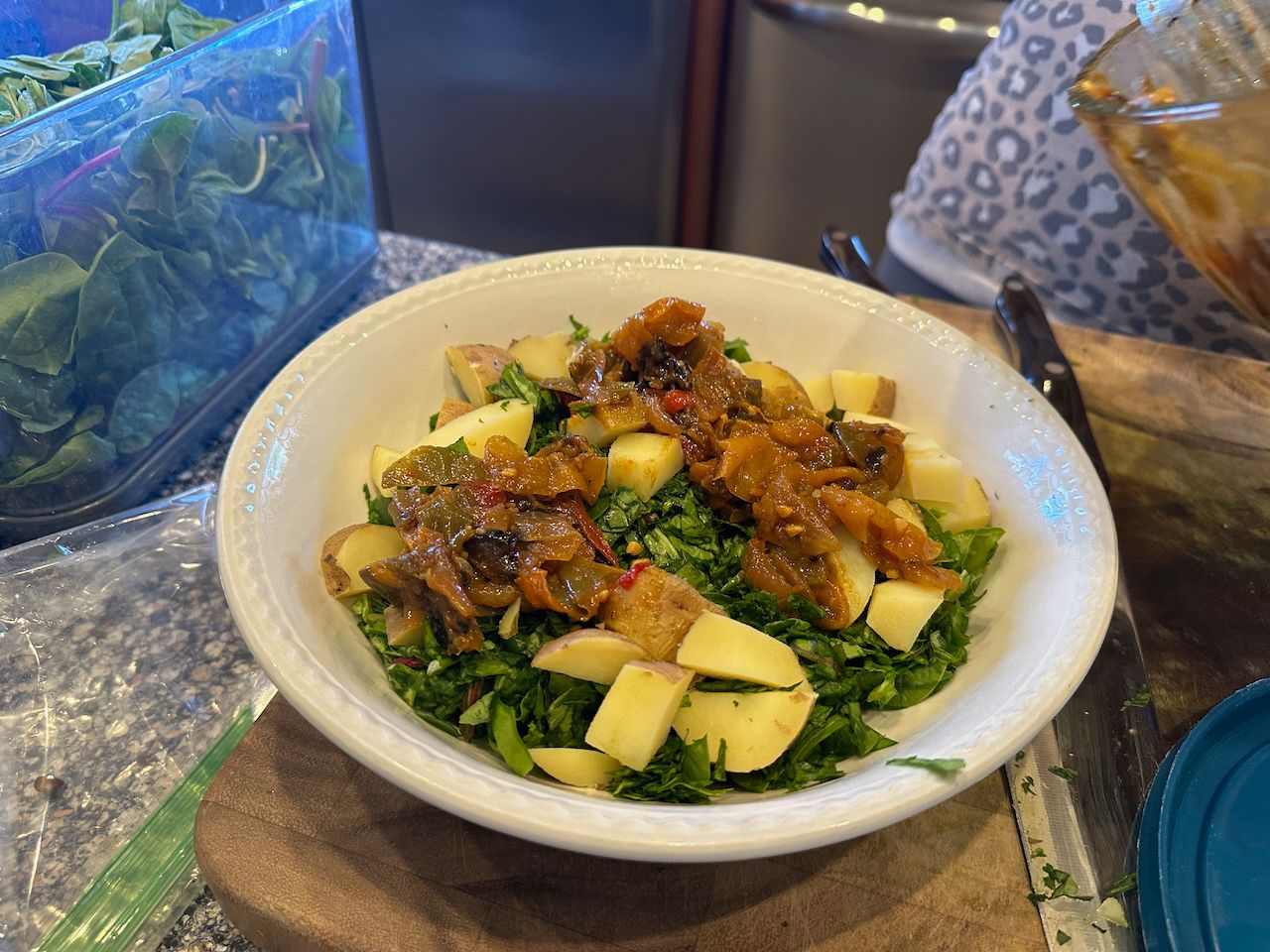 Renee - big ass bunch of power greens, boiled potato, peppers and onions sautéed in water (sauté with water, not oil. don't eat anything with oil!), Renee's cheese sauce, 505 green chile. Heat in the microwave for 3 mins, add tomato. Delish!