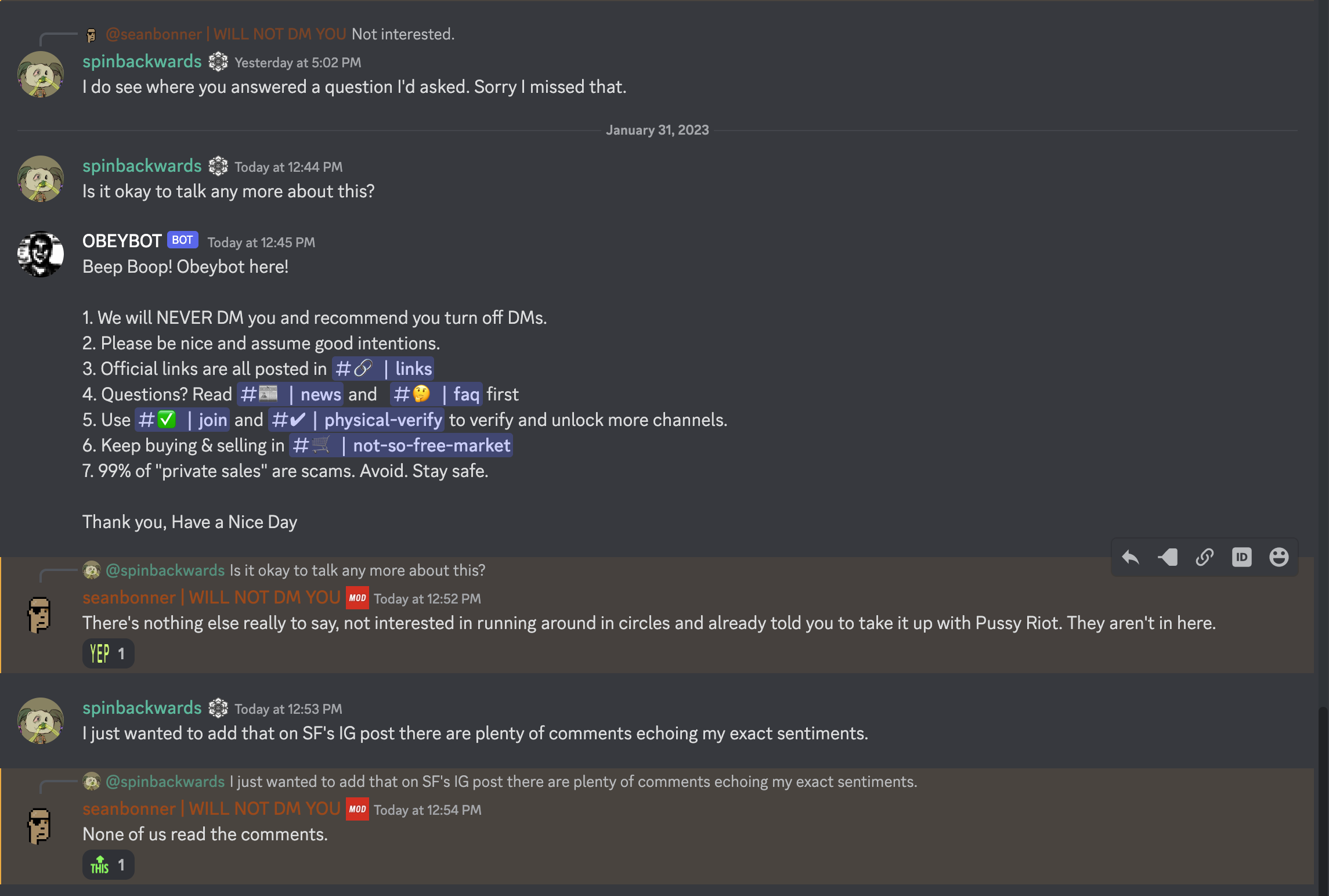 There's more. seanbronner, the Obey Admin told me that 99% of comments on Instagram are "garbage" and "None of us read the comments". I take that to mean he thinks social media comments are trash, ostensibly Twitter. And, that they're not interested in what their customers post on social media.