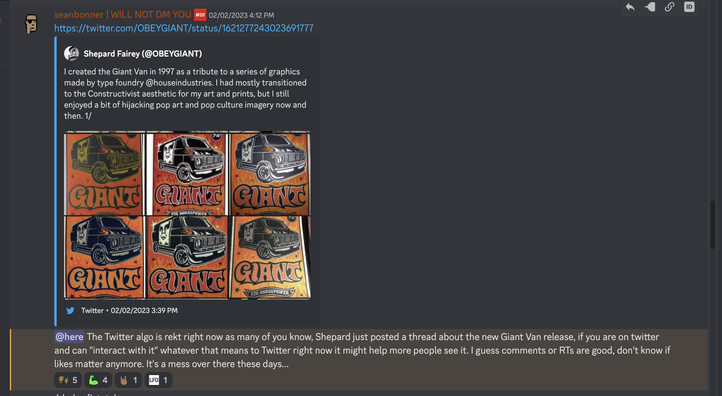 Today I was cruising the Obey Discord and saw that Shepard Fairey posted sales data from his Pussy Riot print that I'm highly critical of.
