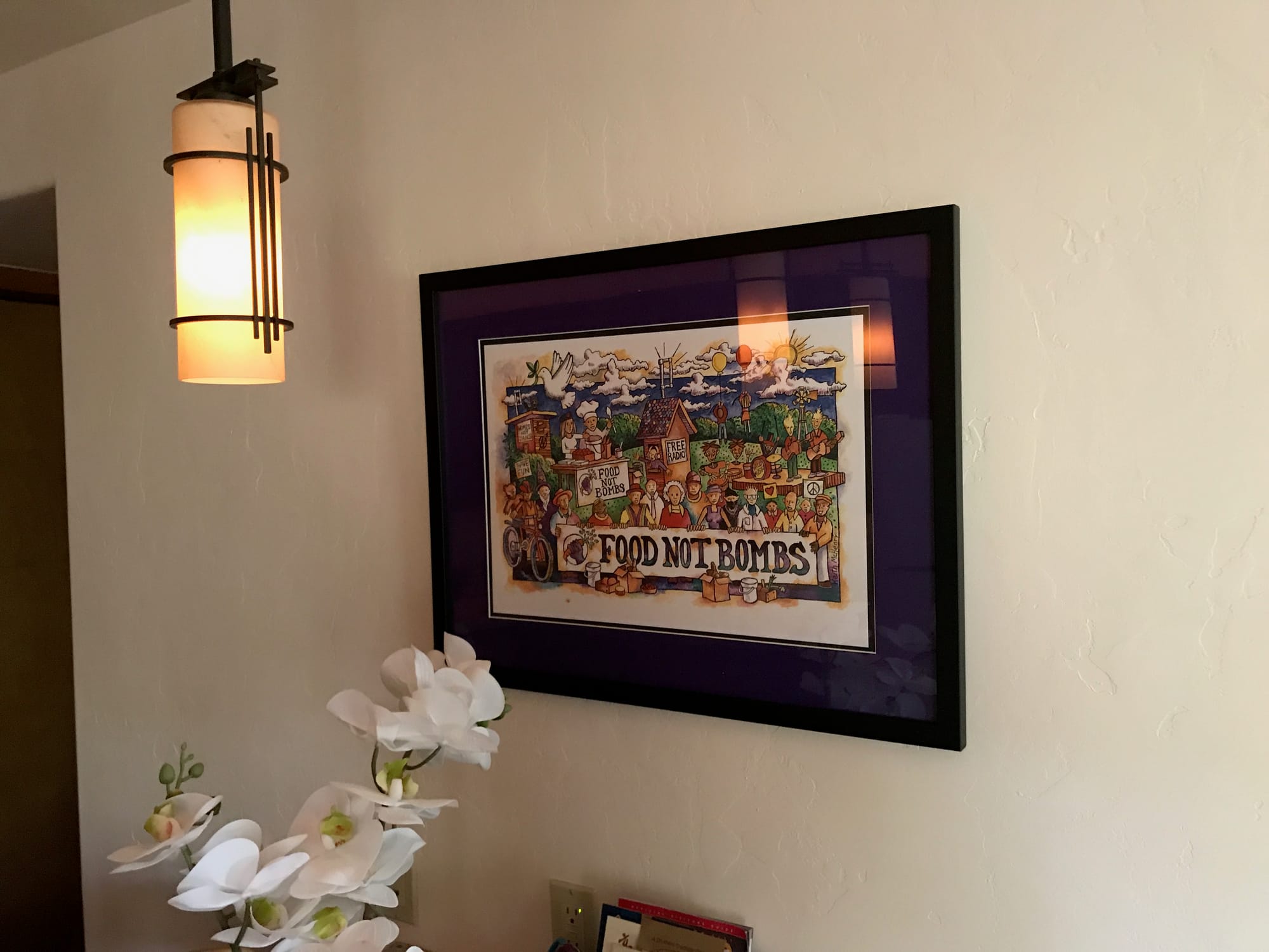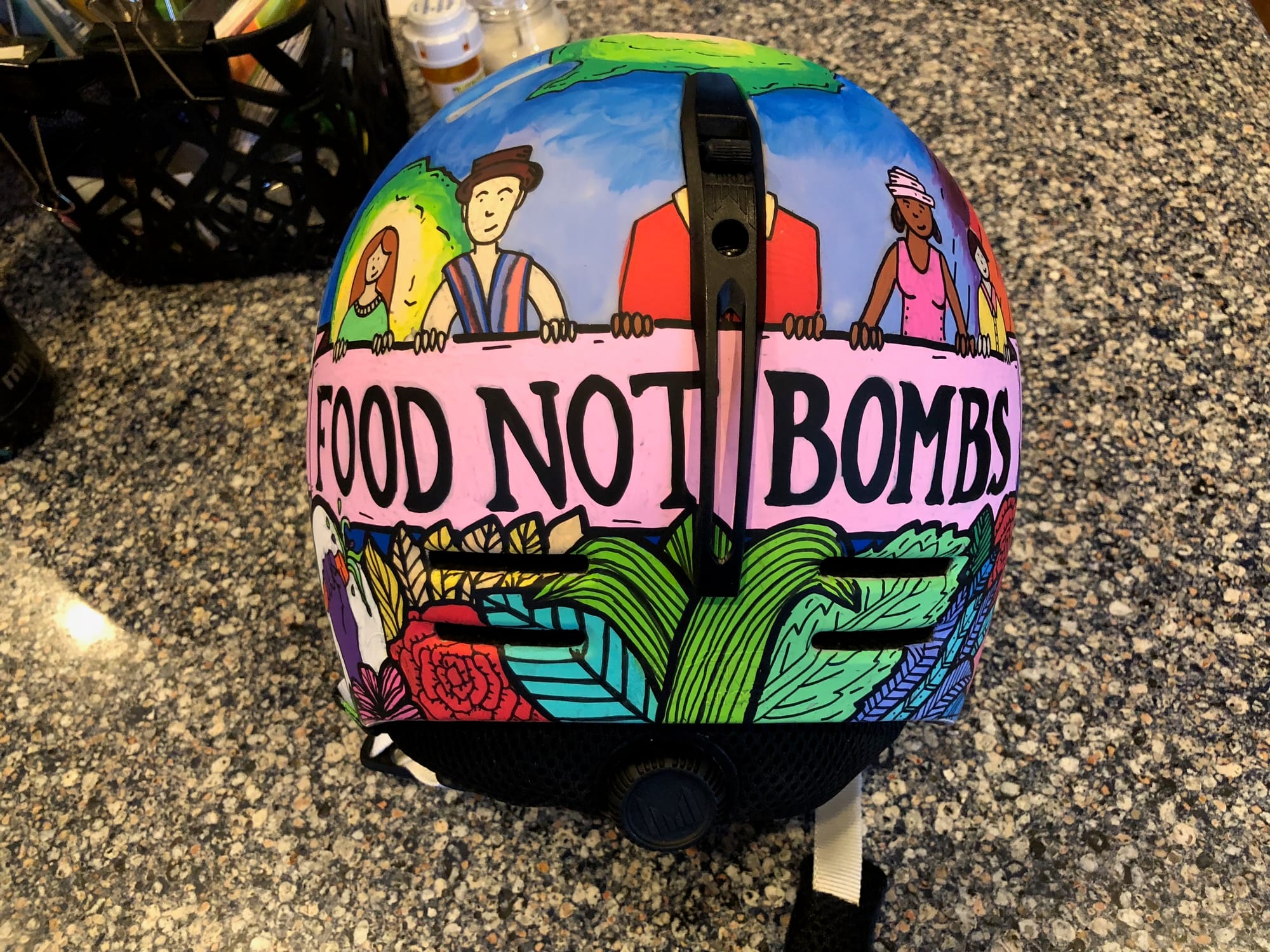 If I can’t get anything from Jane, maybe Food Not Bombs? Food Not Bombs is all about peace and serving vegan food to the unhoused in parks. I love them so much I painted another ski helmet with them on it. And I had a print of theirs framed up, to hang in our home. Hmm. I’ll try spelling it backwards, to get tomorrow’s ideas for violent crimes and terrorism.