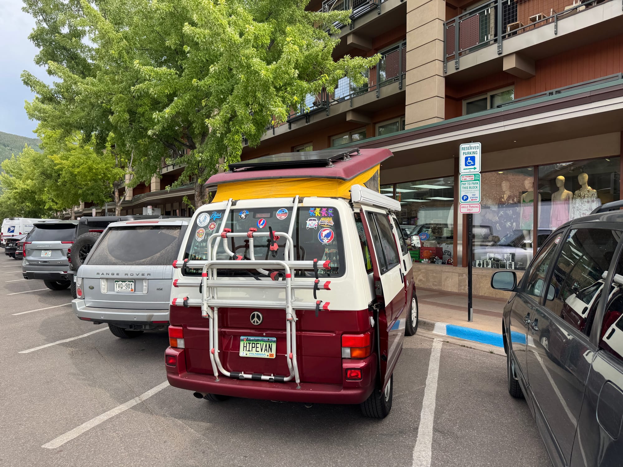 Then after I eat, I hop in our HIPEVAN to commit violent crimes and terrorism. The license plate, peace sign, solar panels, and Grateful Dead stickers are a dead giveaway that I'm about violence and terrorism. Note to self: Replace with MAGA stickers.